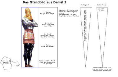 Daniel sieht hier in dem Bildnis eines Standbilds eine Abfolge von Königreichen/Königen. Diese beginnt mit Babylon (also zur Zeit Daniels) und endet mit dem Königreich Gottes, welches dann ewig währt. Das Babylonische Reich hat Israel Königtum beendet. Seither ist Israel unter heidnischer Herrschaft und ohne Königtum des Hauses Davids. Die 4 Königreiche sind: